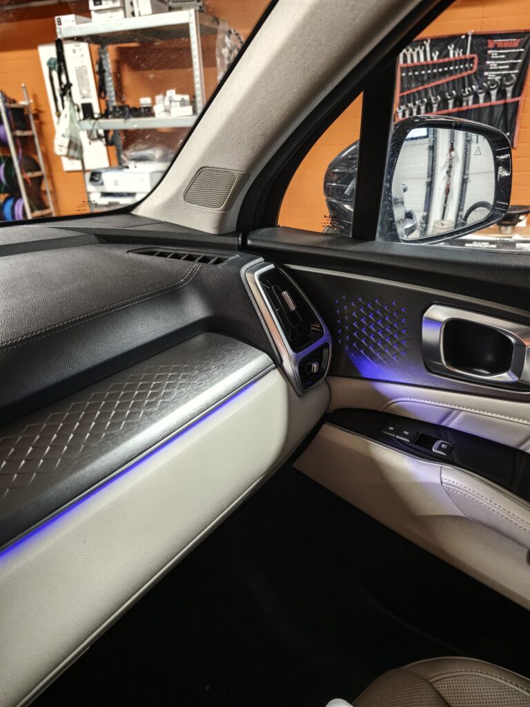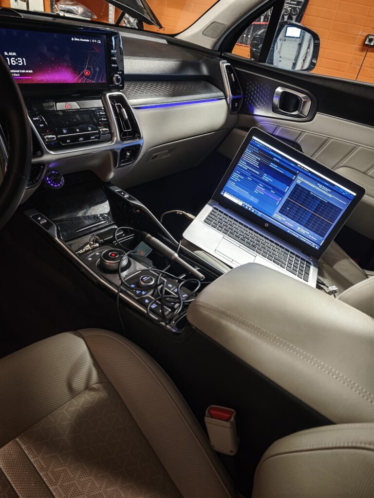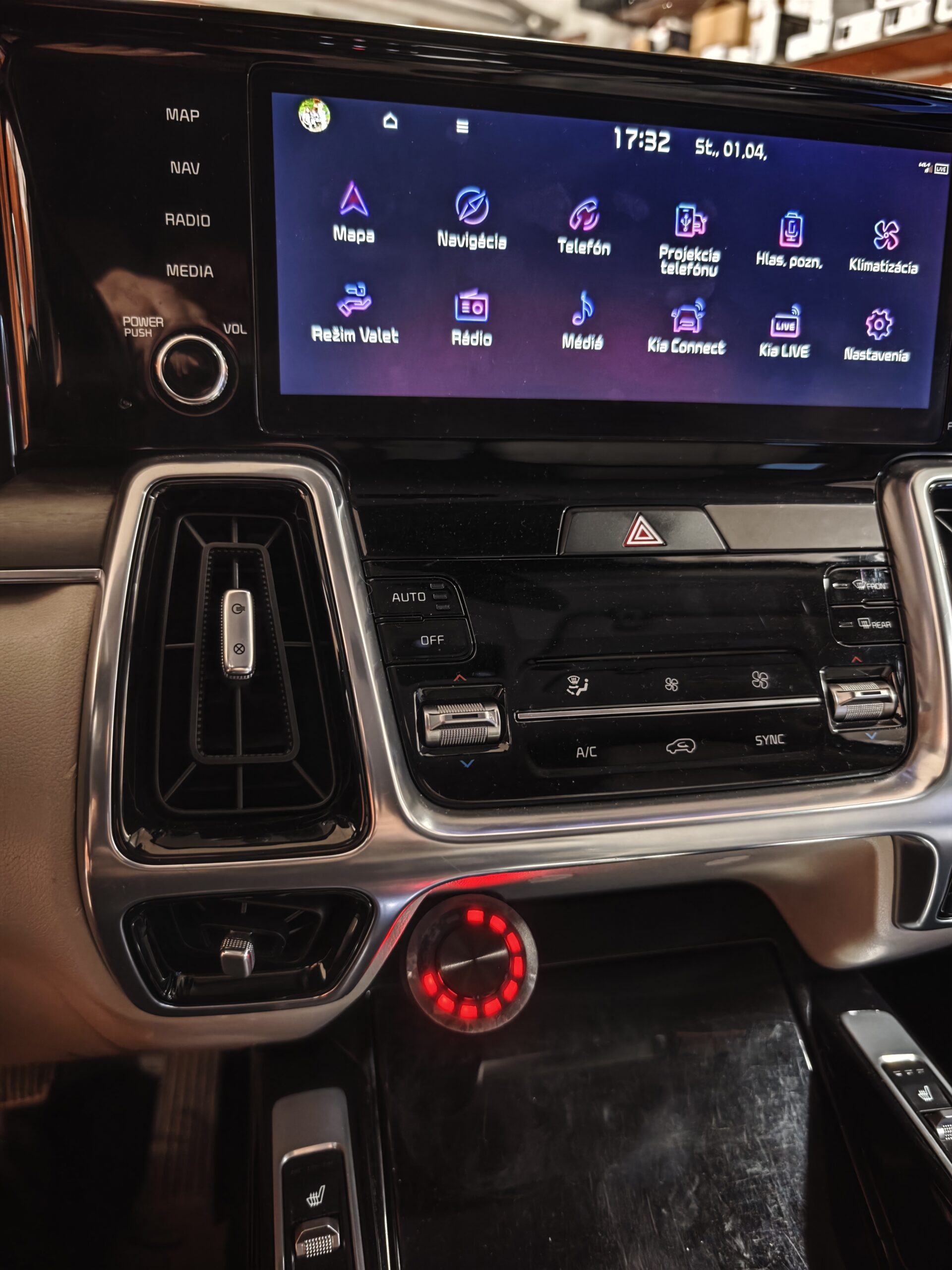 V tejto inštalácii teda voľba padla na malý digitálny zosilňovač s dsp procesorom od Audiotec Fischer – 8 kanálový Match up8 dsp, ktorý umožňuje naladiť nielen výstupný signál, ale už aj signál na vstupe do zosilňovača. Jeho vstupnou de-equalizáciou, odstránením all pass filtrov a vyrovnaním časovej korekcie už mám vlastne k dispozícii plný a čistý signál na vstupe, s ktorým sa pracuje na úplne inej úrovni ako so signálom z pôvodnej jednotky, či s procesorom bez takejto možnosti úpravy signálu už na vstupe. Reproduktory sme použili tiež Helix radu Ci5 a Ci7 – vpredu sa tak podarilo spraviť aktívne 3 pásmo, super bola možnosť jeho montáže bez akéhokoľvek viditeľného zásahu, ako si prial majiteľ Sorenta. Vzadu pod podlahou je umiestnený subwoofer JL audio 10TW3, ktorý napája zosilňovač Hertz (ten už mal majiteľ z predchádzajúceho vozidla). Pod displejom klímy je v držiaku vyrobenom na mieru uchytený Conductor – umožňuje regulovať celkovú hlasitosť, úroveň subwoofer-u, meniť zvukové set-upy. Pre najkvalitnejší posluch je možné streamovať audio aj do externej HD BT karty.