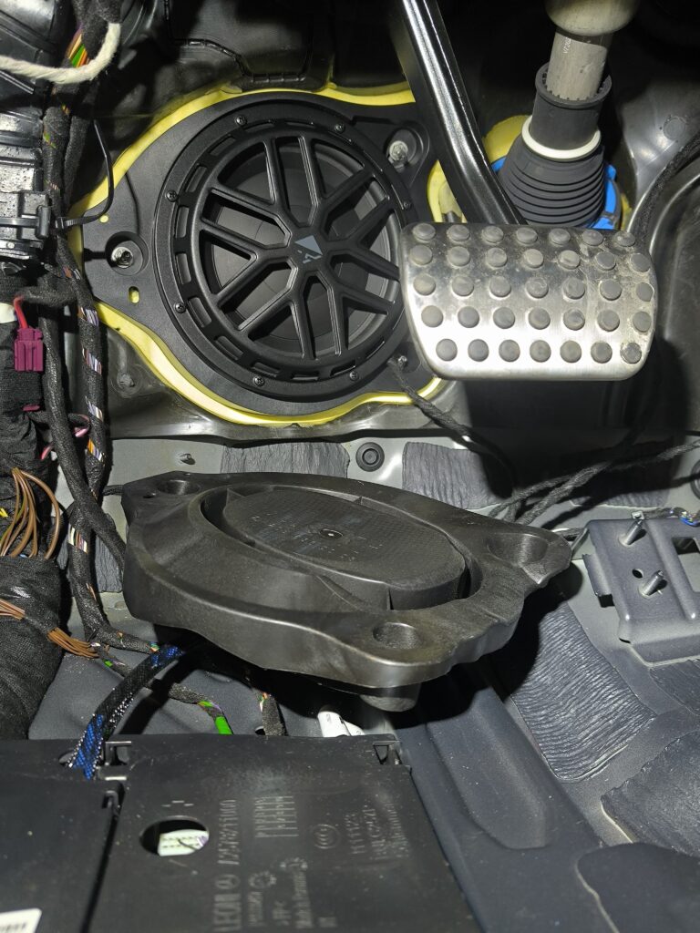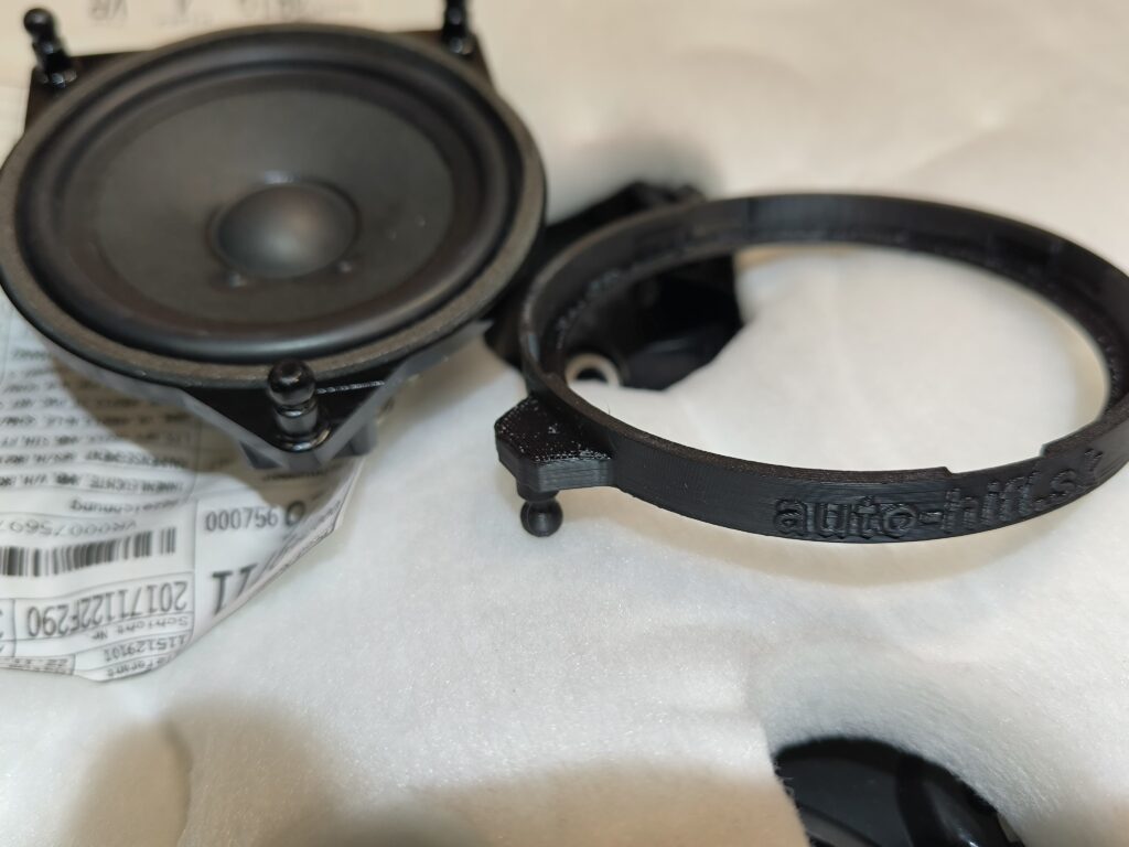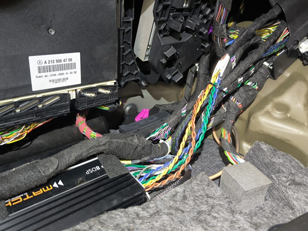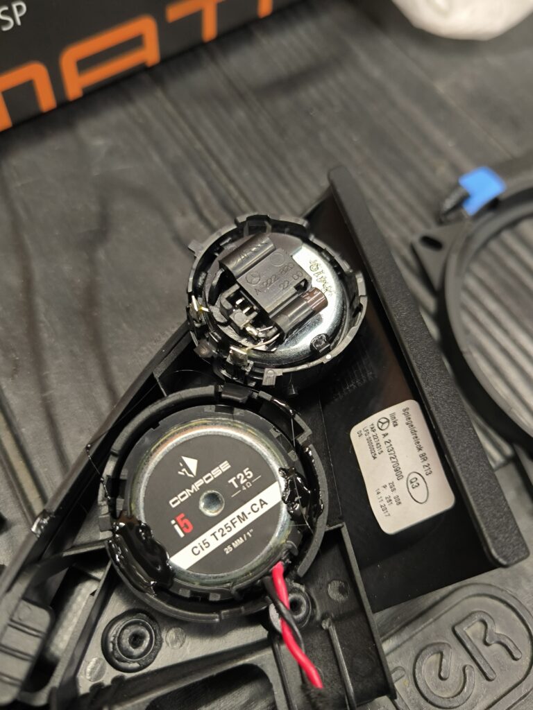 Majiteľ nového Mercedesu E43 amg kombi (s213) nebol spokojný so zvukom. Zvuk bol bez basov, mdlý, zadunený, bez detailov, bez priestorového zobrazenia, hovorené slovo so syntetickým prejavom. Po demontáži použitých reproduktorov sa ani nebolo čomu čudovať. Použité meniče sú nekvalitné už na prvý pohľad: malý magnet, penové závesy, plastové koše, minimálna mechanicķá výchylka (xmax). Reproduktory boli nahradené kombináciou Helix compose Ci3 (stredové a zadné koaxiálne) a Ci5 (predné basové a predné výškové). Takisto káblový zväzok aj redukcie na basové Ci5 sú od Audiotec Fischer priamo pre tento model vozidla, takže bez akéhokoľvek zásahu do pôvodnej kabeláže. Redukcie pre stredové repro som opäť vytlačil pomocou 3D tlače s uchytením tiež priamo do pôvodných pozícii.