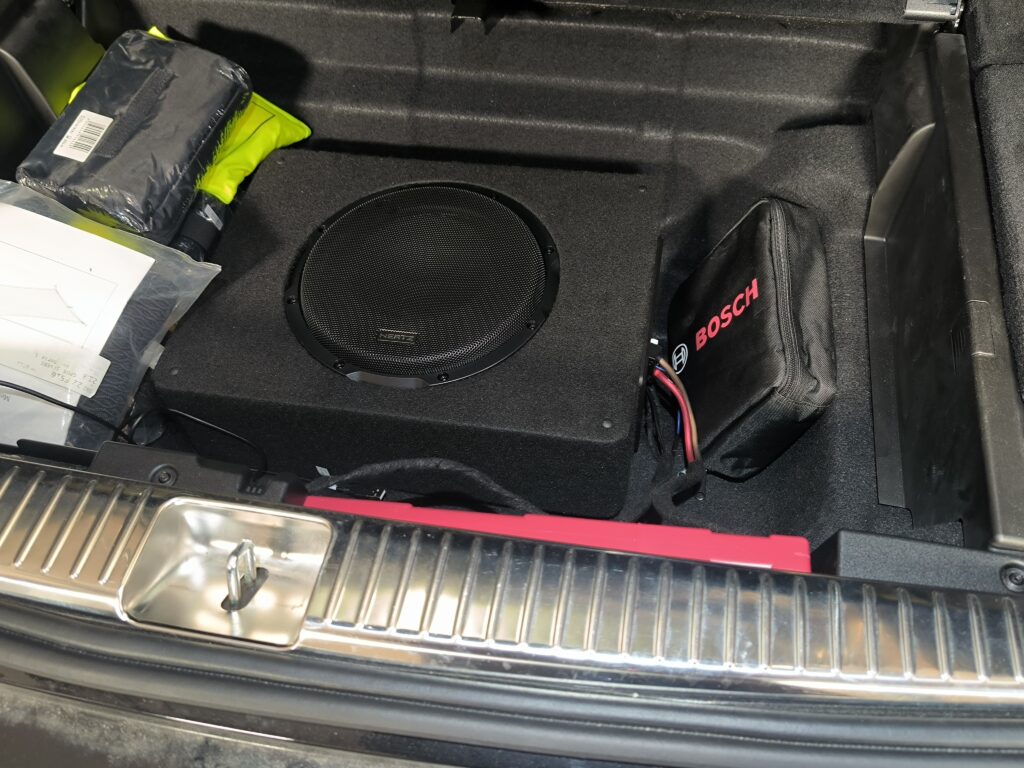 Zosilňovač je Match up8 dsp, od nemeckého výrobcu Audiotec Fischer. Aktuálne ide o najlepší produkt v daných rozmeroch na trhu, čo sa týka zvuku, ceny, so špičkovým procesorom a to spolu v neuveriteľne malých rozmeroch. Ďalšie výhody, kôli ktorým mu žiadny produkt nedokáže konkurovať sú vstupná equalizácia (s množstvom nastavení) funkcie real center processing, fyziologické nastavenia zvýraznenia basov a výšok DLC, možnosť priameho pripojenia zvukovej karty, s možnosťou nastavenie equalizácie kalibrovaným mikrofónom priamo v reálnom čase pomocou ružového šumu atď. Navyše s najnovšiou aktualizáciou firmware-u sa možnosti zvukových nastavení opäť posunuli ďalej. Zosilňovač je osadený tak, že je vizuálne ukrytý, pritom nemá akýkoľvek problém s priehrevaním, s čím má práve veľa konkurenčných produktov veľký problém. Výstup z dsp procesora ovláda ešte aktívny subwoofer priemeru 25cm pod podlahou kufra, takže tiež nijako neobmedzuje priestor kufra.
