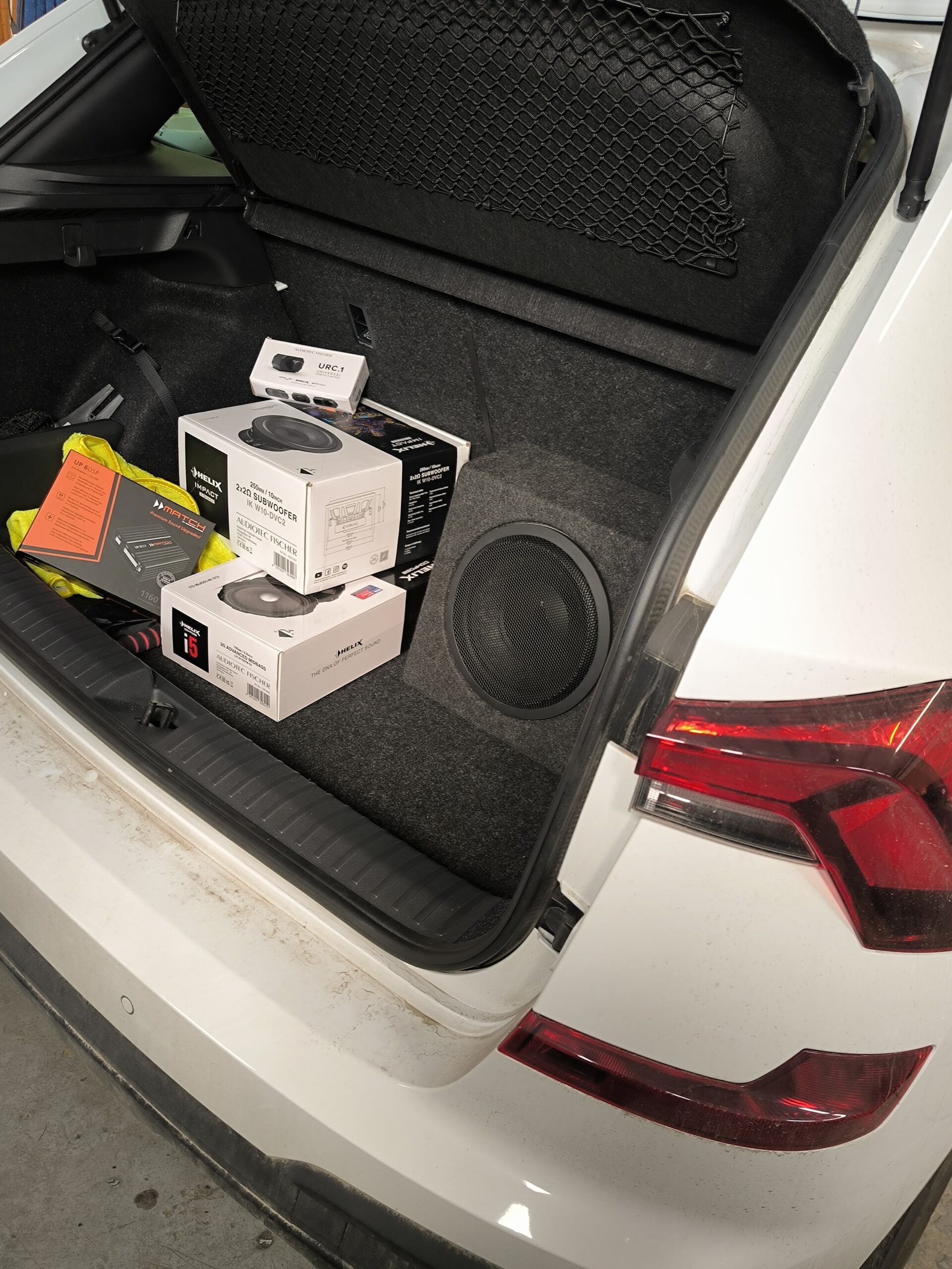 Inštalácia do Škody Kamiq – zosilňovač s dsp procesorom Match up 6 je skrytý v blízkosti oem audio jednotky kôli zachovaniu čo najkratších signálových/výkonových vetiev. Reproduktroy sú Helix Ci5, výškové Seas/Ci5, subwoofer Helix IK 10 v uzavretom boxe. Zvuku výrazne pomohla de-equalizácia pôvodnej jednotky. Na ovládanie úrovne sw slúži externý diaľkový ovládač urc-1.