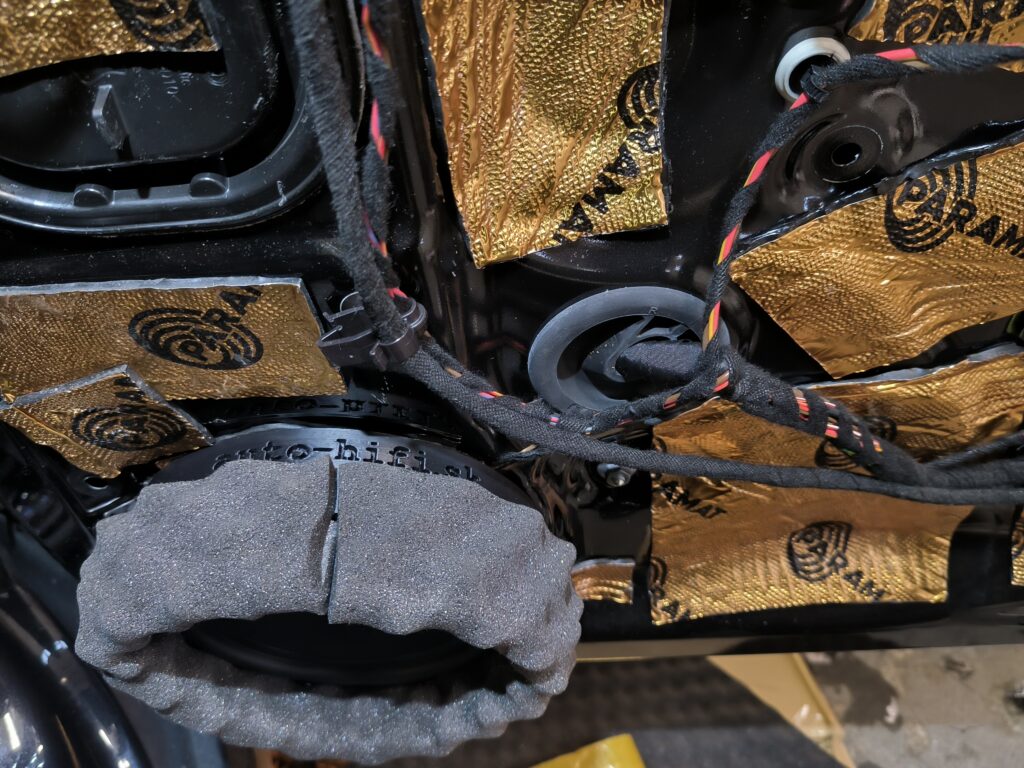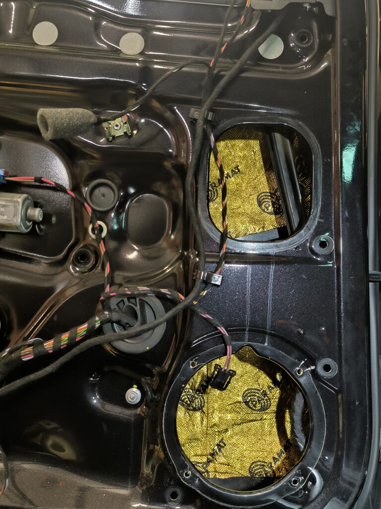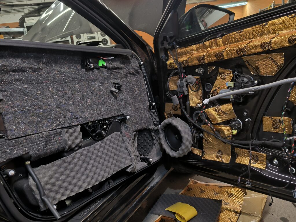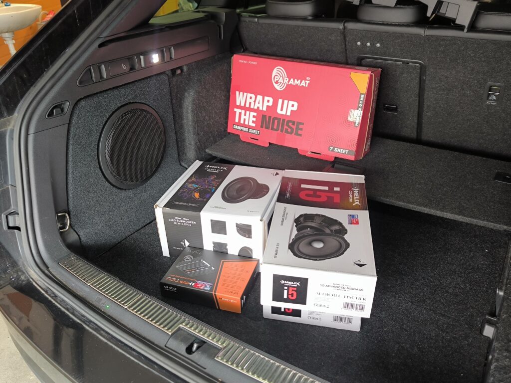 Škoda Superb, nenápadná inštalácia bez obmedzenia priestoru. Zosilňovač Match up6 je skrytý v A stĺpiku, predné a zadné dvere vytlmené, redukcie na reproduktory pomocou 3D tlače. Reproduktory som použil Helix Compose. Subwoofer Helix IK 10 2×2 ohm je umiestnený v ľavej bočnici. Všetko ovládanie zachované cez pôvodný audio systém.